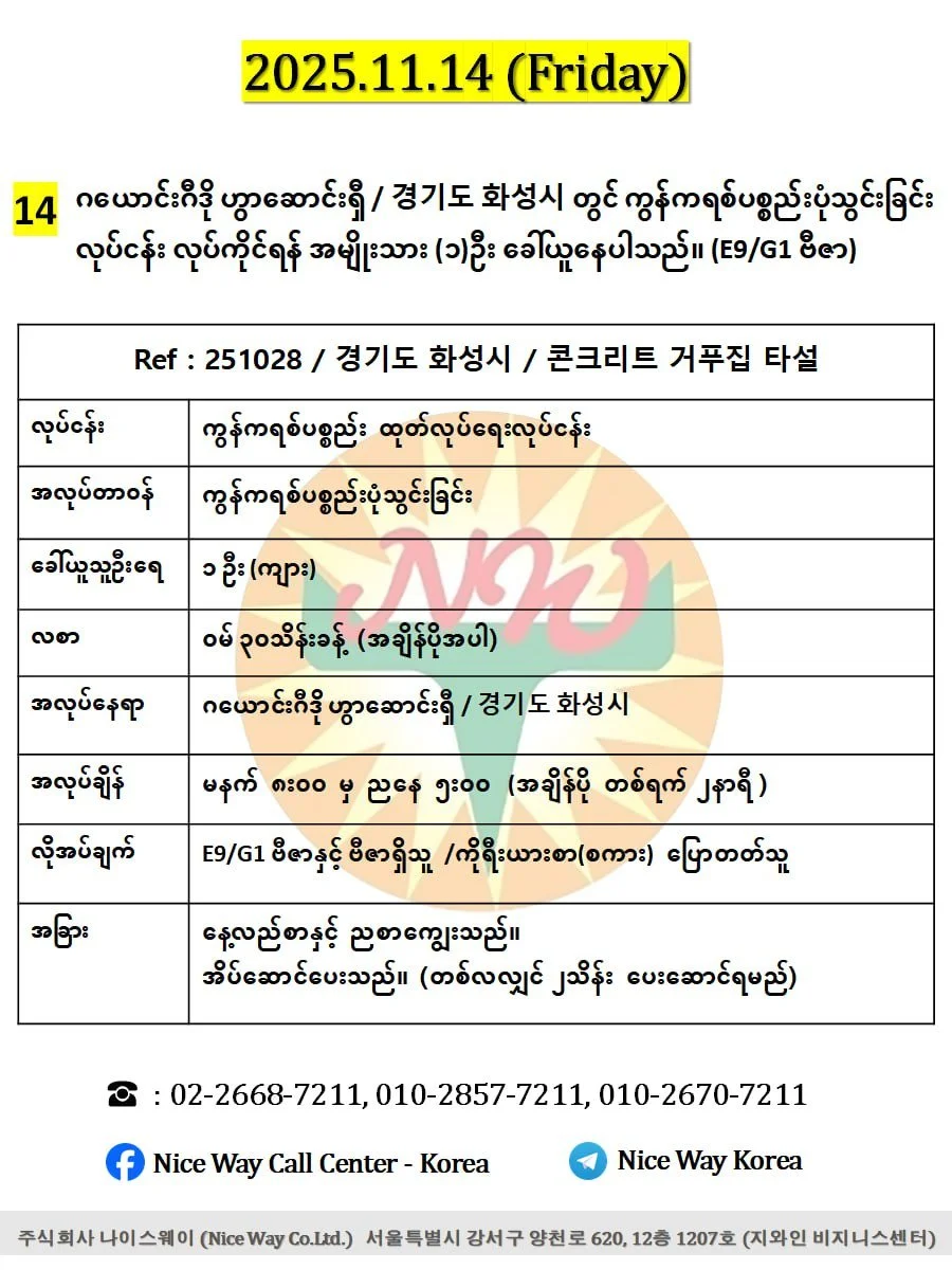 ဂယောင်းဂီဒို ဟွာဆောင်းရှီ / 경기도 화성시 တွင် ကွန်ကရစ်ပစ္စည်းပုံသွင်းခြင်းလုပ်ငန်း လုပ်ကိုင်ရန် အမျိုးသား (၁)ဦး ခေါ်ယူနေပါသည်။ (E9/G1 ဗီဇာ)