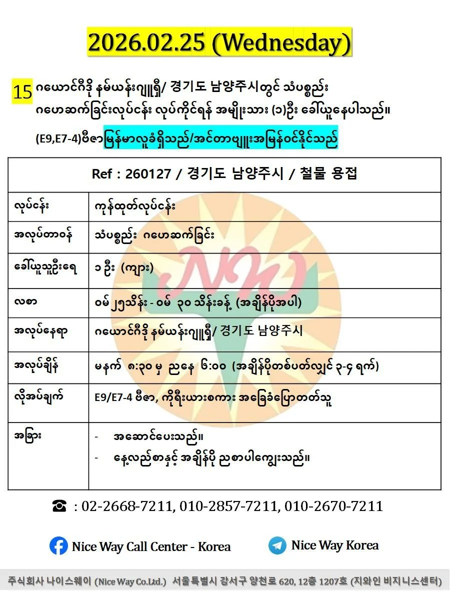 ဂယောင်ဂီဒို နမ်ယန်းဂျူရှီ/ 경기도 남양주시တွင် သံပစ္စည်း ဂဟေဆက်ခြင်းလုပ်ငန်း လုပ်ကိုင်ရန် အမျိုးသား (၁)ဦး ခေါ်ယူနေပါသည်။