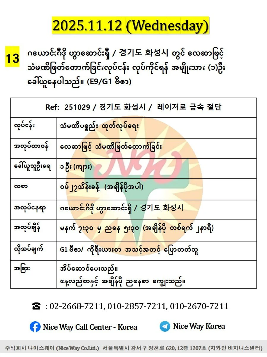 ဂယောင်းဂီဒို ဟွာဆောင်းရှီ / 경기도 화성시 တွင် လေဆာဖြင့် သံမဏိဖြတ်တောက်ခြင်းလုပ်ငန်း လုပ်ကိုင်ရန် အမျိုးသား (၁)ဦး ခေါ်ယူနေပါသည်။ (E9/G1 ဗီဇာ)