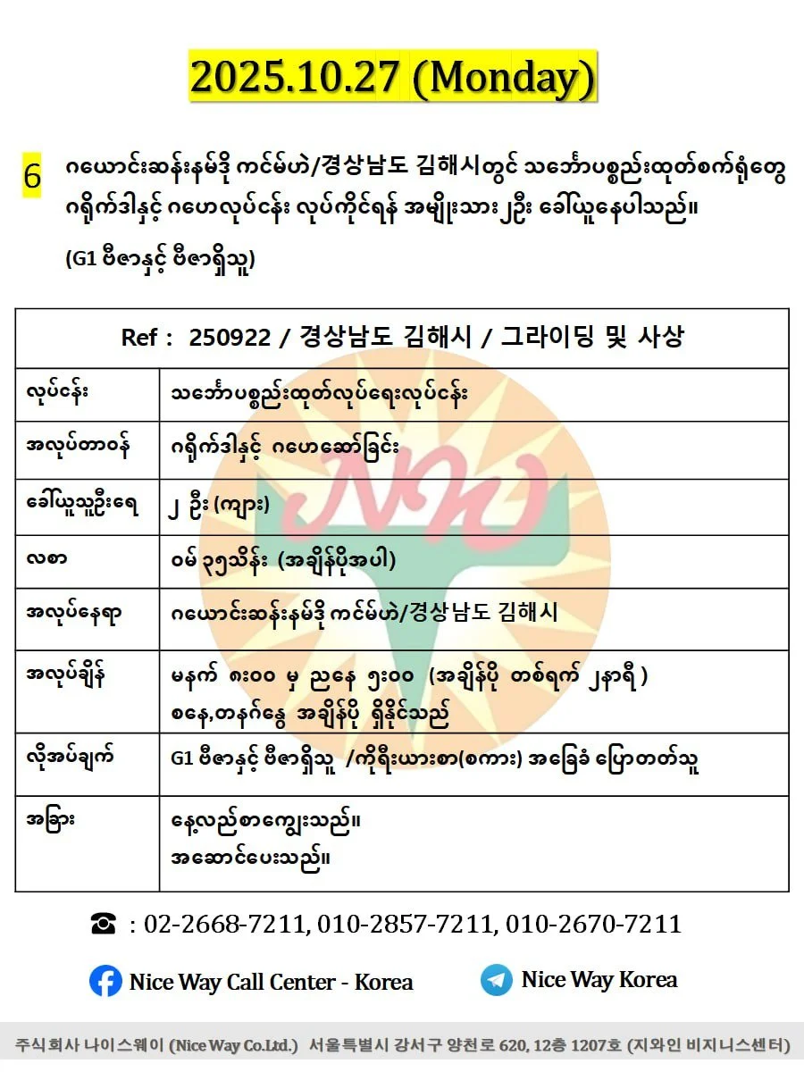 ဂယောင်းဆန်းနမ်ဒို ကင်မ်ဟဲ/경상남도 김해시တွင် သင်္ဘောပစ္စည်းထုတ်စက်ရုံတွေ ဂရိုက်ဒါနှင့် ဂဟေလုပ်ငန်း လုပ်ကိုင်ရန် အမျိုးသား 1ဦး။(G1)