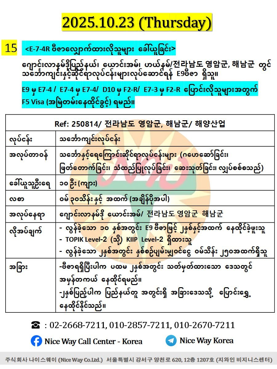 ဂျိုလ်လာနမ်ဒိုပြည်နယ်၊ ယောင်းအမ်၊ဟေနမ်၊ /전라남도 영암군, 해남군 တွင် သင်္ဘောကျင်းနှင့်ဆိုင်ရာလုပ်ငန်းများလုပ်ဆောင်ရန် E9ဗီဇာ ရှိသူ။<E-7-4R ဗီဇာလျှောက်ထားလိုသူများ ခေါ်ယူခြင်း>