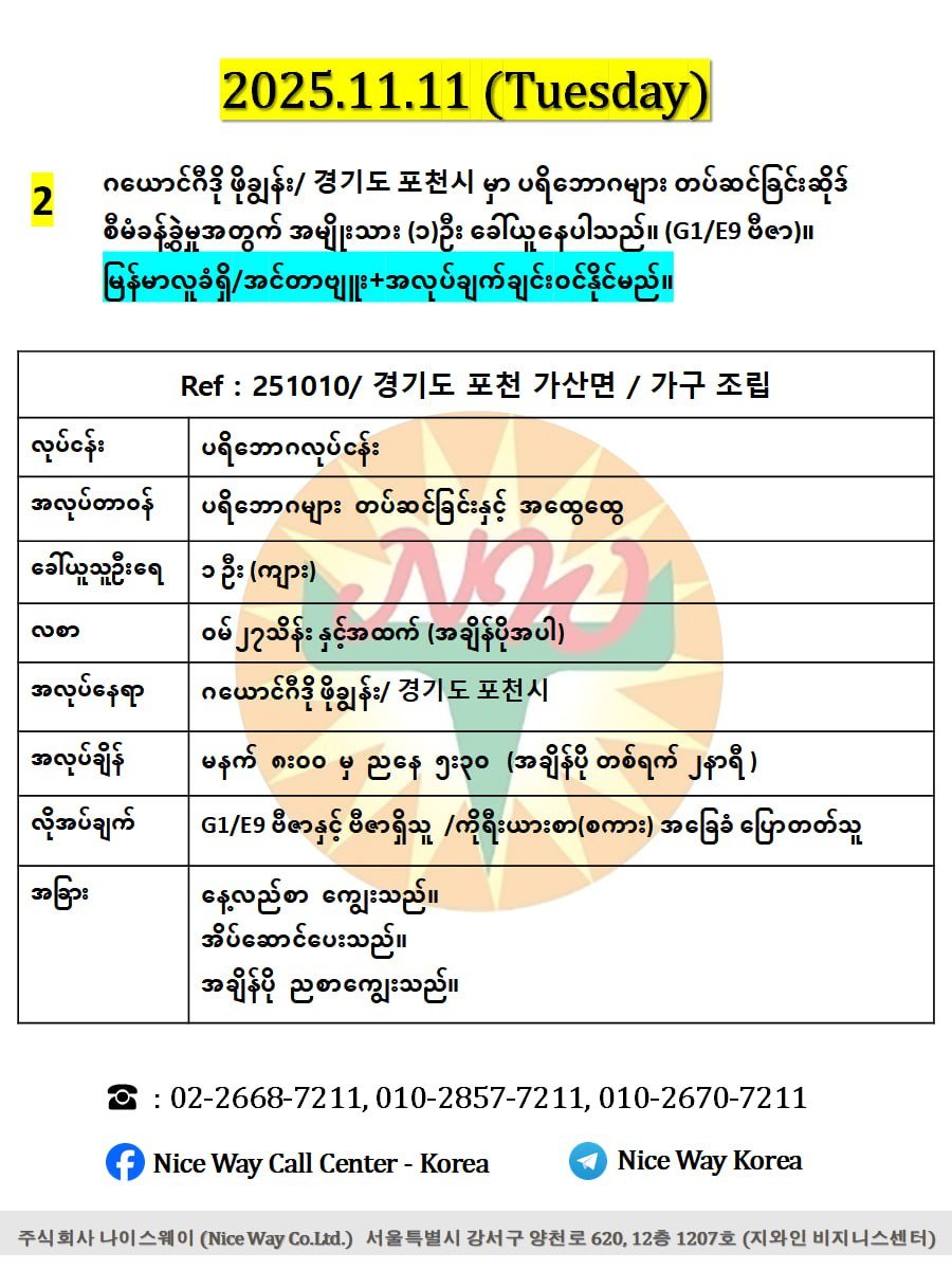 ဂယောင်ဂီဒို ဖိုချွန်း/ 경기도 포천시 မှာ ပရိဘောဂများ တပ်ဆင်ခြင်းဆိုဒ် စီမံခန့်ခွဲမှုအတွက် အမျိုးသား (၁)ဦး၊ (G1 ဗီဇာနှင့် ဗီဇာရှိသူ)။
