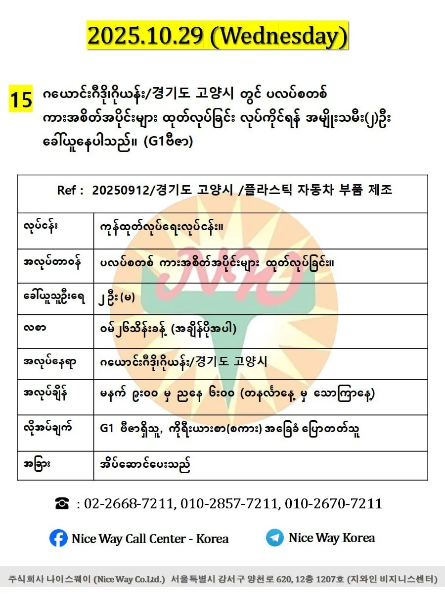 ဂယောင်းဂီဒို၊ဂိုယန်း/경기도 고양시 တွင် ပလပ်စတစ် ကားအစိတ်အပိုင်းများ ထုတ်လုပ်ခြင်း လုပ်ကိုင်ရန် အမျိုးသမီး(၂)ဦး ခေါ်ယူနေပါသည်။ (G1)
