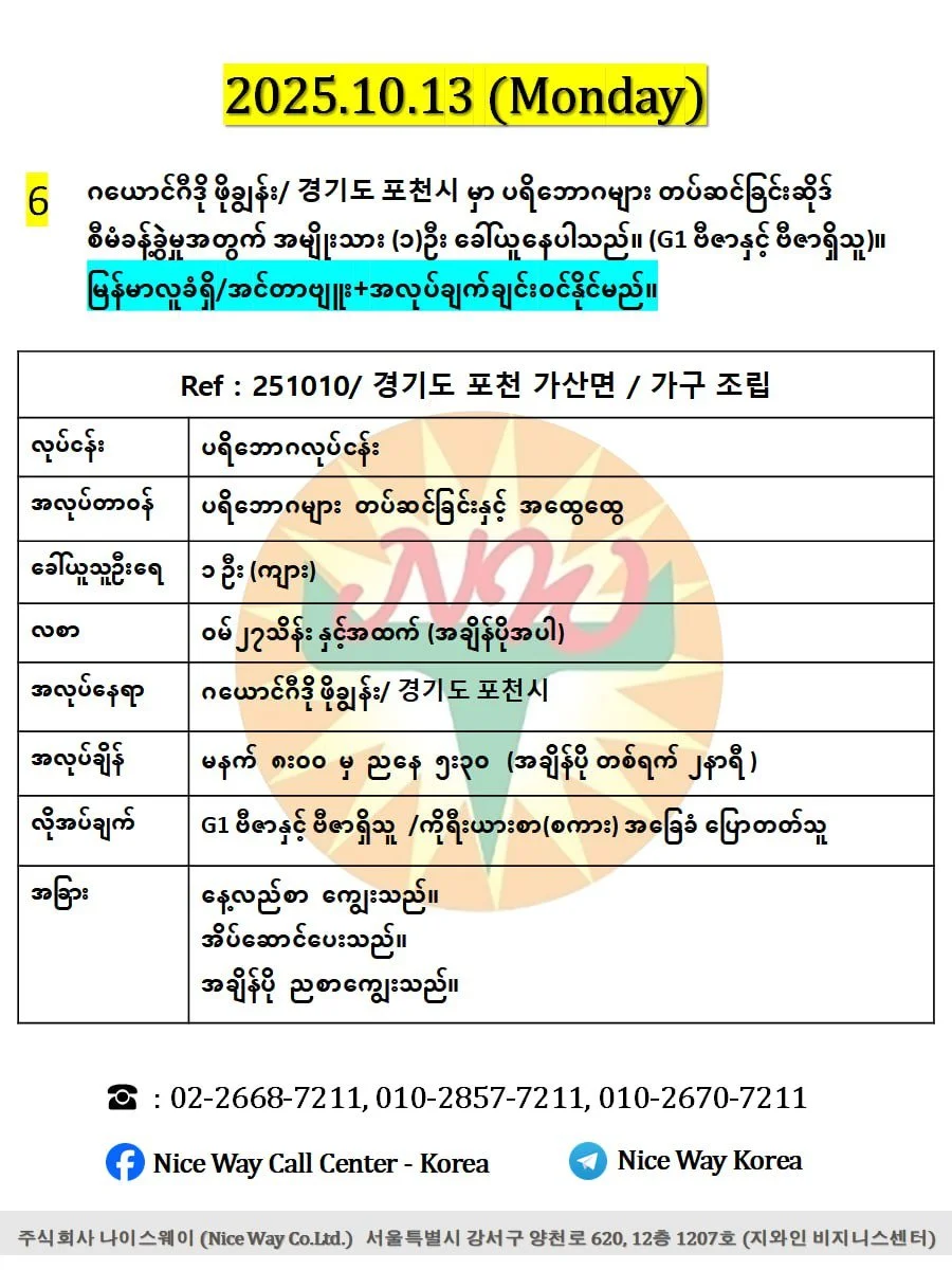 ဂယောင်ဂီဒို ဖိုချွန်း/ 경기도 포천시 မှာ ပရိဘောဂများ တပ်ဆင်ခြင်းဆိုဒ် စီမံခန့်ခွဲမှုအတွက် အမျိုးသား (၁)ဦး၊ (G1 ဗီဇာနှင့် ဗီဇာရှိသူ)။