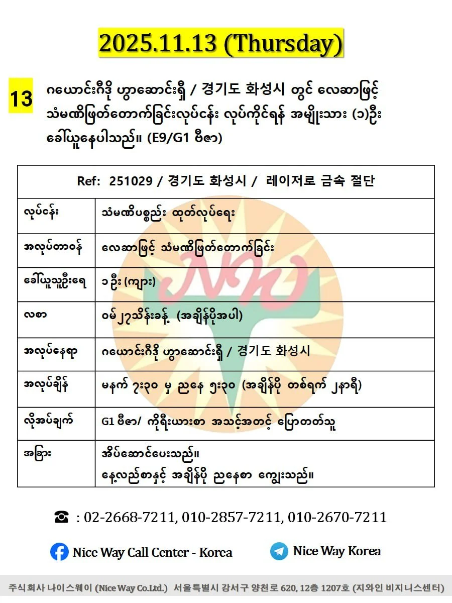 ဂယောင်းဂီဒို ဟွာဆောင်းရှီ / 경기도 화성시 တွင် လေဆာဖြင့် သံမဏိဖြတ်တောက်ခြင်းလုပ်ငန်း လုပ်ကိုင်ရန် အမျိုးသား (၁)ဦး ခေါ်ယူနေပါသည်။ (E9/G1 ဗီဇာ)