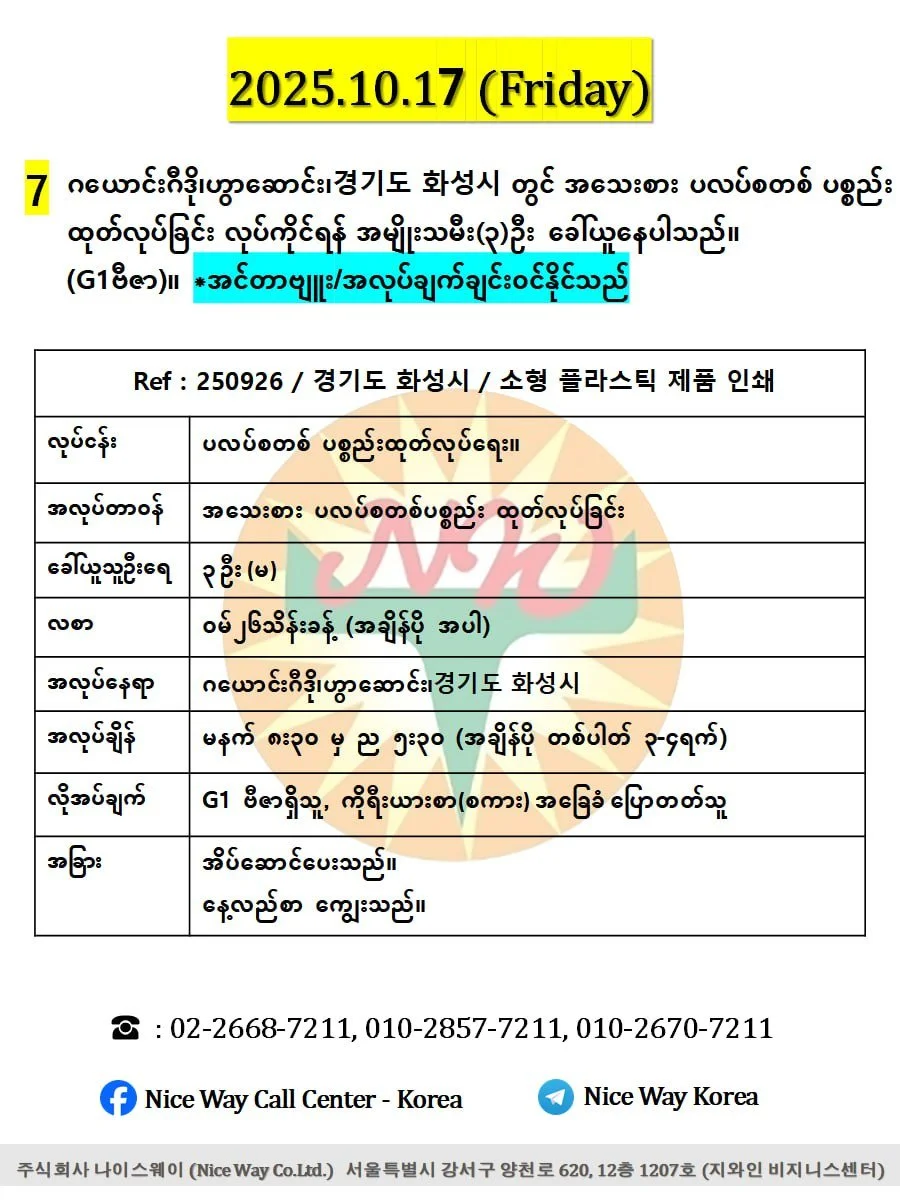 ဂယောင်းဂီဒို၊ဖာဂျူ/경기도 파주시 တွင် ဆိုင်းဘုတ်လုပ်ငန်း အခြေခံသုံး ပစ္စည်း ထုတ်လုပ်ခြင်း လုပ်ကိုင်ရန် အမျိုးသား(၁)ဦး။(G1 ဗီဇာနှင့်ဗီဇာရှိသူ)