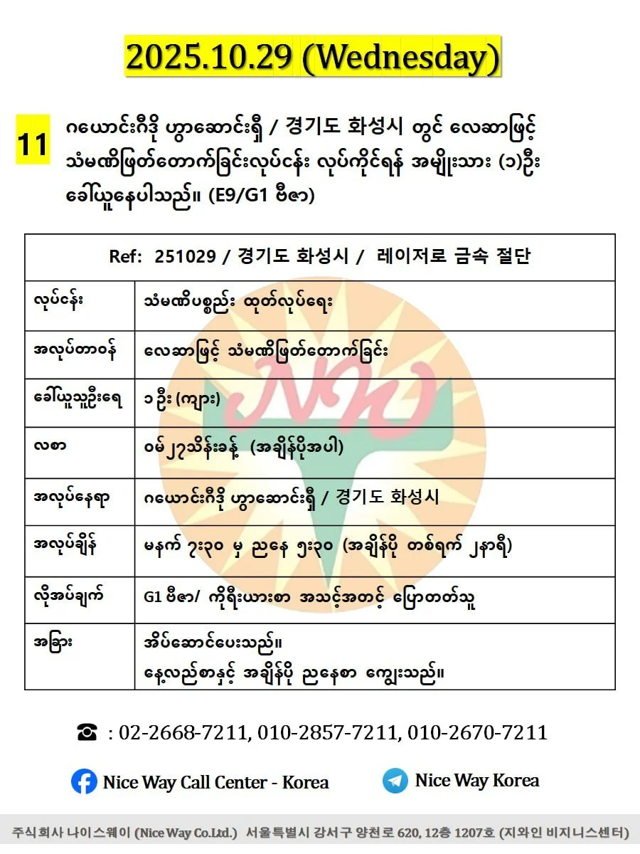 ဂယောင်းဂီဒို ဟွာဆောင်းရှီ / 경기도 화성시 တွင် လေဆာဖြင့် သံမဏိဖြတ်တောက်ခြင်းလုပ်ငန်း လုပ်ကိုင်ရန် အမျိုးသား (၁)ဦး ခေါ်ယူနေပါသည်။ (E9/G1 ဗီဇာ)