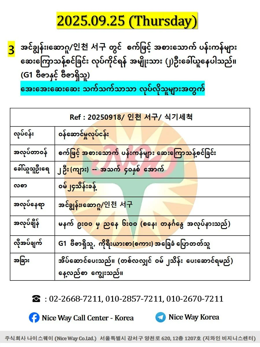 အင်ချွန်း၊ဆောဂူ/인천 서구 တွင် စက်ဖြင့် အစားသောက် ပန်းကန်များ ဆေးကြောသန့်စင်ခြင်း လုပ်ကိုင်ရန် အမျိုးသား (၂)ဦးခေါ်ယူနေပါသည်။ (G1 ဗီဇာနှင့် ဗီဇာရှိသူ)