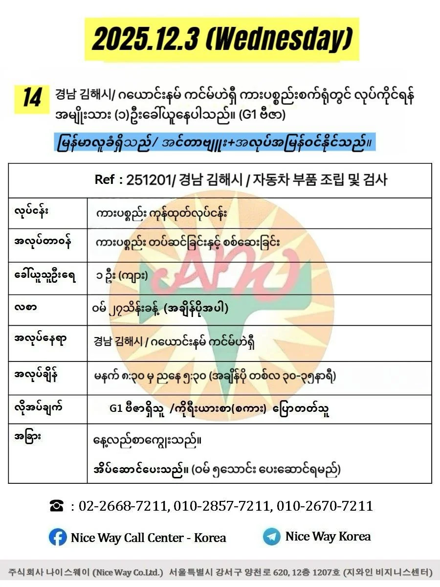 ဂယောင်နမ် ကင်မ်ဟဲရှီ/ 경남 김해시 ကားစက်ရုံတွင်လုပ်ကိုင်ရန်အမျိုးသား ၁ ဦးခေါ်ယူနေပါသည်။(G1 ဗီဇာ)