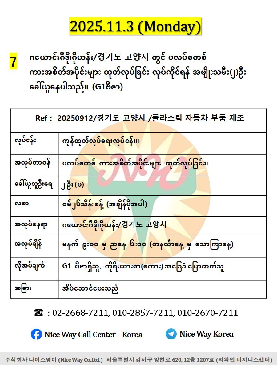 ဂယောင်းဂီဒို၊ဂိုယန်း/경기도 고양시 တွင် ပလပ်စတစ် ကားအစိတ်အပိုင်းများ ထုတ်လုပ်ခြင်း လုပ်ကိုင်ရန် အမျိုးသမီး(၂)ဦး ခေါ်ယူနေပါသည်။ (G1)