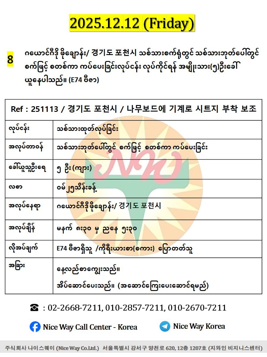 ဂယောင်ဂီဒို ဖိုချောန်းမြို့ / 경기도 포천시 သစ်သားစက်ရုံတွင် သစ်သားဘုတ်ပေါ်တွင် စက်ဖြင့် စတစ်ကာ ကပ်ပေးခြင်းလုပ်ငန်း လုပ်ကိုင်ရန်အမျိုးသား(၅)ဦးခေါ်ယူနေပါသည်။(E74 ဗီဇာ)