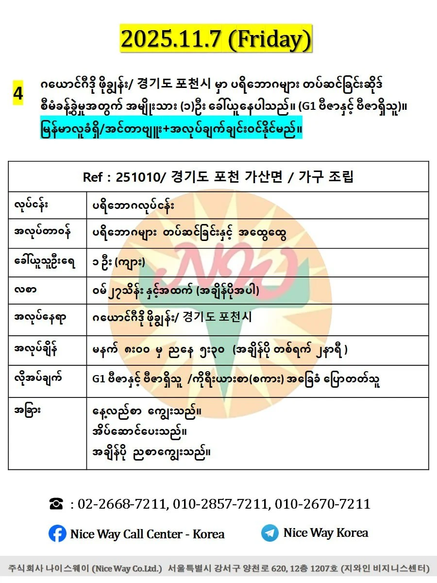 ဂယောင်ဂီဒို ဖိုချွန်း/ 경기도 포천시 မှာ ပရိဘောဂများ တပ်ဆင်ခြင်းဆိုဒ် စီမံခန့်ခွဲမှုအတွက် အမျိုးသား (၁)ဦး၊ (G1 ဗီဇာနှင့် ဗီဇာရှိသူ)။