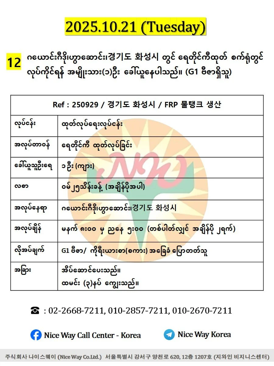 ဂယောင်းဂီဒို၊ဟွာဆောင်း၊경기도 화성시 တွင် ရေတိုင်ကီထုတ်စက်ရုံတွင်လုပ်ကိုင်ရန် အမျိုးသား (၁)ဦး။(G1 ဗီဇာနှင့်ဗီဇာရှိသူ)။
