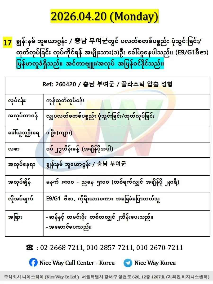 ချွန်းနမ် ဘူယောဂွန်း / 충남 부여군 ပလတ်စတစ်ပစ္စည်း ပုံသွင်း/ထုတ်လုပ်ခြင်း လုပ်ကိုင်ရန် အမျိုးသား(၁)ဦး ခေါ်ယူနေပါသည်။ (E9/G1 ဗီဇာ)