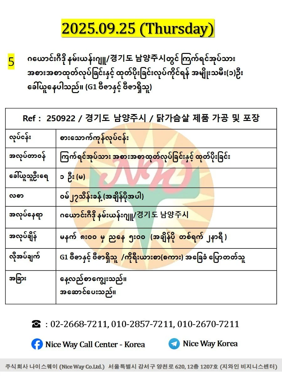 ဂယောင်းဂီဒို နမ်းယန်းဂျူ/경기도 남양주시တွင် ကြက်ရင်အုပ်သားအစားအစာထုတ်လုပ်ခြင်းနှင့် ထုတ်ပိုးခြင်းလုပ်ကိုင်ရန် အမျိုးသမီး(၁)ဦး။(G1)