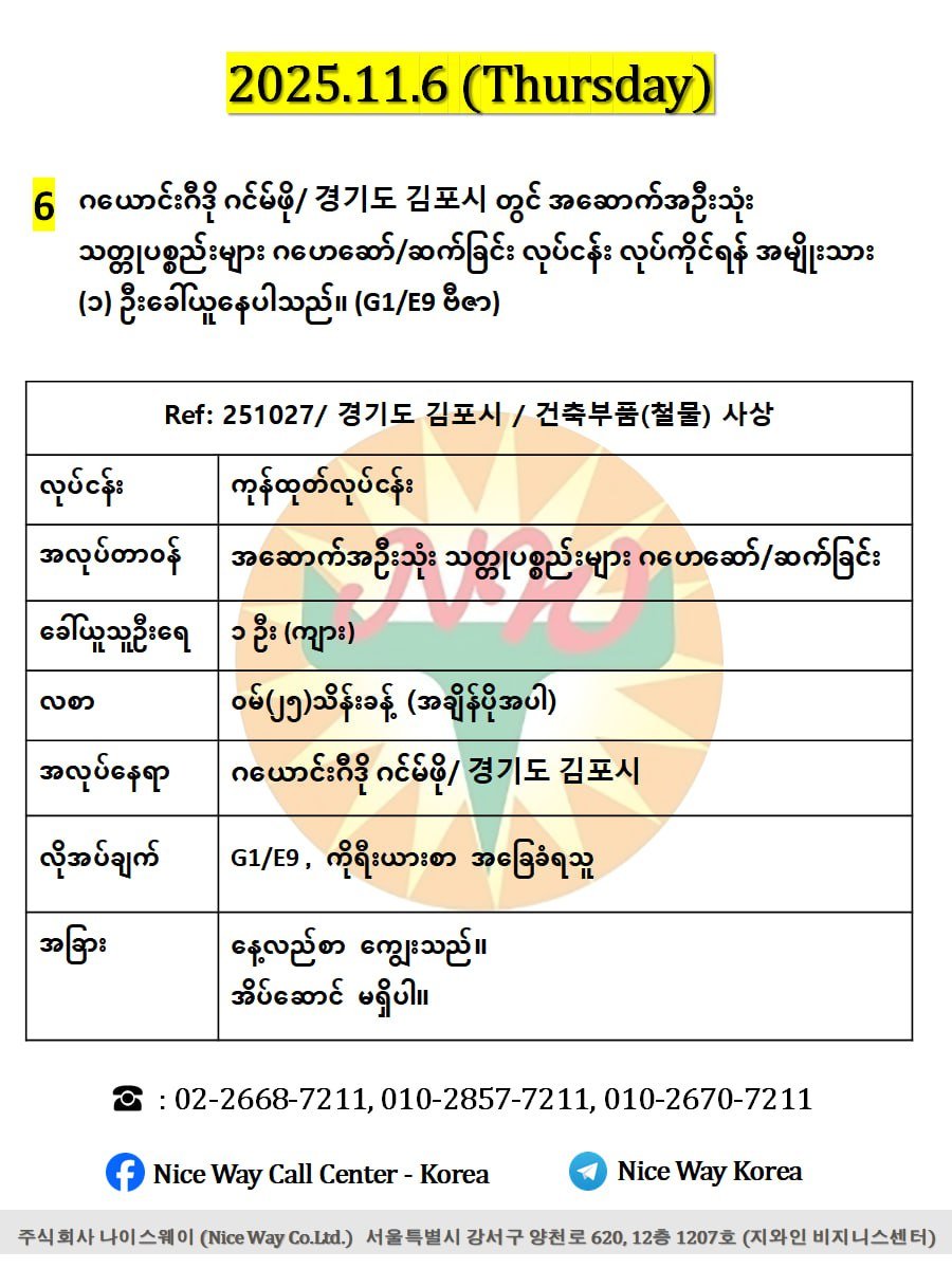 ဂယောင်းဂီဒို ဂင်မ်ဖို/ 경기도 김포시 တွင် အဆောက်အဦးသုံး သတ္တုပစ္စည်းများ ဂဟေဆော်/ဆက်ခြင်း လုပ်ငန်း လုပ်ကိုင်ရန်အမျိုးသား (၁) ဦးခေါ်ယူနေပါသည်။(G1/E9 ဗီဇာ)