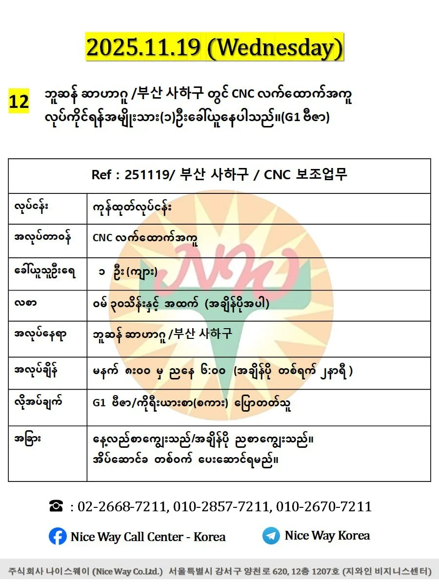 ဘူဆန် ဆာဟာဂူ /부산 사하구 တွင် CNC လက်ထောက်အကူ လုပ်ကိုင်ရန်အမျိုးသား(၁)ဦးခေါ်ယူနေပါသည်။(G1 ဗီဇာ)