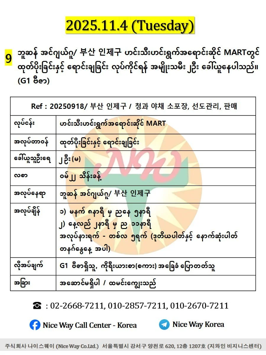 ▶️ အလုပ်တည်နေရာ- ဘူဆန် အင်ဂျယ်ဂူ/ 부산 인제구