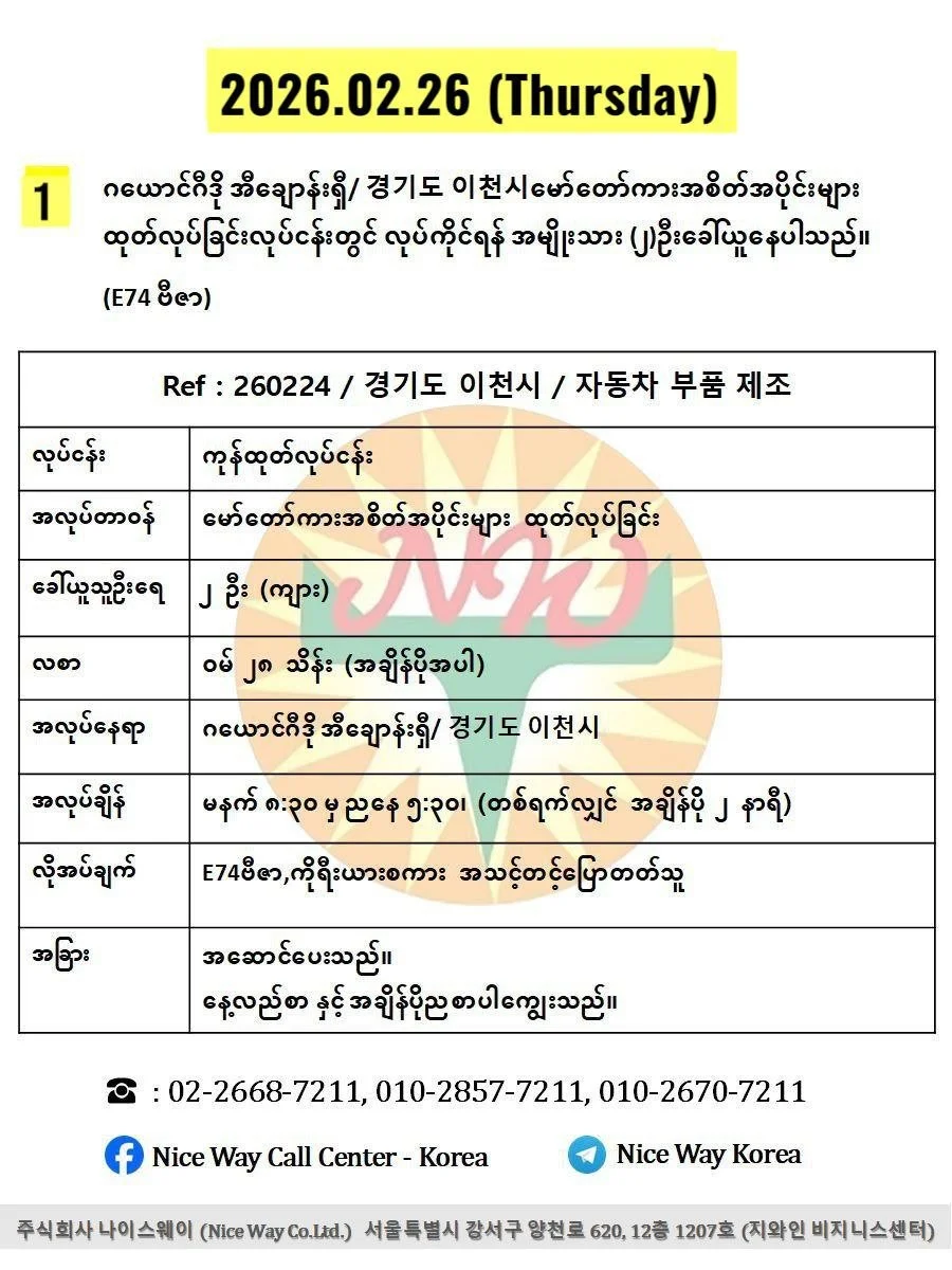 ဂယောင်ဂီဒို အီချောန်းရှီ/ 경기도 이천시မော်တော်ကားအစိတ်အပိုင်းများ ထုတ်လုပ်ခြင်းလုပ်ငန်းတွင် လုပ်ကိုင်ရန် အမျိုးသား (၂)ဦးခေါ်ယူနေပါသည်။(E74 ဗီဇာ)
