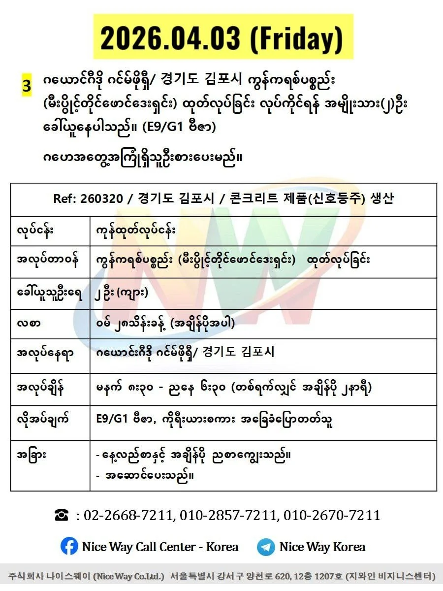 ဂယောင်ဂီဒို ဂင်မ်ဖိုရှီ/ 경기도 김포시 ကွန်ကရစ်ပစ္စည်း (မီးပွိင့်တိုင်ဖောင်ဒေးရှင်း) ထုတ်လုပ်ခြင်းလုပ်ငန်းတွင်လုပ်ကိုင်ရန် အမျိုးသား(၂)ဦးခေါ်ယူနေပါသည်။(E9/G1 ဗီဇာ)